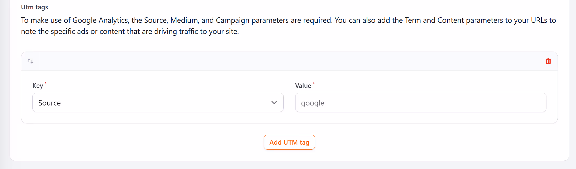 While creating your short link or qr code, you can add UTM tags to each one. Simply chose from the dropdown box "UTM Parameters", and click "Add UTM tag".